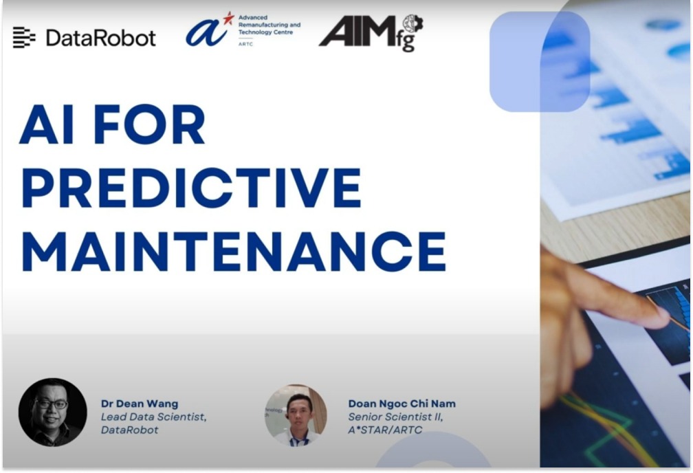 News & Events Stay informed with the latest breakthroughs, collaborations, and events shaping the future of AI innovation. Filter by: Events News Videos All Videos AI for Predictive Maintenance – DataRobot x ARTC x AIMfg Webinar 15 April 2025 Events Industrial Transformation Asia-Pacific (ITAP) 2024 15 October 2024 15 - 17 October 2024 Videos Sectoral AI Centre of Excellence for Manufacturing (AIMfg): Driving Innovation in Manufacturing 1 October 2024 News New AI Centre Of Excellence To Drive Innovation In Manufacturing 30 September 2024